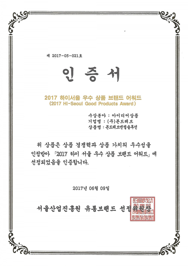 하이서울 2017 엔젤솔루션 우수상품 인증서